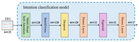 Figure 4 shows the intention classification model’s specific structure. The model contains one transformer encode module and dense layers. The input is EEG sequence data. Since there are two types of EEG intentions, the model outputs a 2-classification result.