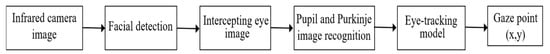 The eye movement data were collected through a non-wearable eye-tracking device previously developed and designed by the team. The hardware of this eye-tracking device consists of four infrared light sources and a near-infrared camera. Figure 5 shows the measurement flow of the eye tracker. The eye image was acquired from the near-infrared camera image by face detection. The eye images were input into the pupil and Pulchin spot recognition model, calculating the pupil center and four Pulchin spot coordinates. All the coordinate data were input into the eye-tracking model to obtain the subject’s gaze point on the screen. The sampling frequency of the eye tracker was 90 Hz.
