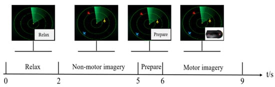 Before the experiment, the subjects put on the EEG cap, kept their hands naturally still and sat on the chair. The distance between the subject’s eyes and the display screen was about 60 cm. We ran the virtual radar interface program while debugging the eye movement acquisition and EEG measurement devices. At the beginning of the experiment, the radar interface on the screen did not display any aircraft targets, only showing the word relax. At this time, the subject was in a relaxed state. After 2 s, a randomly selected red, yellow, or blue airplane appeared on the screen, each with a different trajectory. The subject gazed at the red (or yellow or blue) airplane without imagining the motion of selecting a target. After 3 s, the screen displayed the word prepare, prompting the subject to prepare to imagine the motion. Then, 1 s later, a mouse image appeared on the screen. The subject continued to gaze at the red (or yellow or blue) airplane while imagining using the right hand to click the mouse to select the target. The entire experiment lasted for 3 s. The duration of one set of experiments was 9 s. Figure 7 is the timing diagram of the above experimental process.