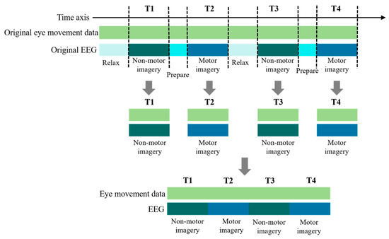 During the experiment, the eye tracker and EEG recorded data simultaneously. We preprocessed the EEG signals by filtering twice. The first one was 50 Hz trap filtering to reduce industrial frequency interference. The next was NLMS adaptive filtering to remove noise that deviates severely from the mean. The data collection software recorded the data and timestamps. We sliced the original dataset by timestamp and labeled each slice of data. Figure 8 shows an example of data slicing.