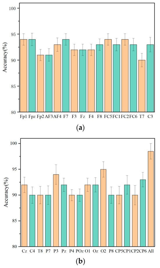The intention classification module in the human–machine interaction model determines whether the subject intends to select the aircraft target by extracting features from the EEG signals. Previous studies have used both single-channel and multi-channel EEG data for classification. Therefore, we compare the difference in classification accuracy between inputting single-channel EEG data and 32-channel EEG channel data. Figure 9 shows the accuracy of the model with different numbers of channels. ‘All’ represents 32 channels. From Figure 10, we can see that when using 32 channels of EEG data, the model has a classification accuracy of up to 98.5%. Therefore, we send all 32-lead EEG data recorded into the model for training.