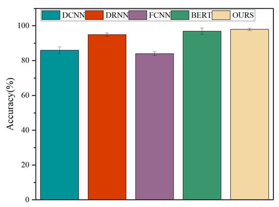 To evaluate the performance of the EEG intention classification models, we use the DCNN [27], DRCNN [28], FCNN [29], and BERT [30] for EEG classification on this paper’s dataset as well. All models use 32-channel EEG data. Figure 10 demonstrates the classification accuracy of the compared models on this paper’s dataset. The results in Figure 10 show that our proposed method obtained the highest classification accuracy. It is better than the other models.