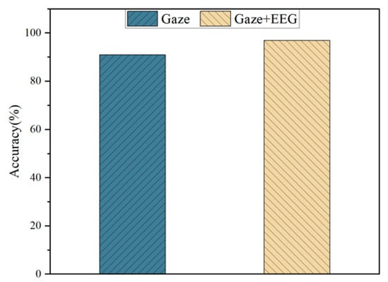 Figure 12 shows the interaction accuracy of the two methods. The multimodal interaction model we constructed has an accuracy of over 95% for each of the selected airplanes. The results show that the gaze+EEG interaction was superior to the gaze interaction.