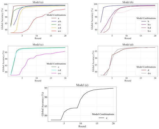 Figure 4 also illustrates that larger models, such as ‘a’ and ‘b’, exhibited faster convergence due to their higher parameter count and greater representational capacity, which enabled them to learn patterns more efficiently during training. In contrast, smaller models like ‘e’, which have fewer parameters and lower complexity, converged more slowly as they required more iterations to achieve comparable performance. Additionally, in heterogeneous settings where model ‘e’ was combined with larger models, the global model’s convergence was slowed. This occurred because the smaller model introduced weaker updates into the aggregation process, reducing the overall pace of optimization. The disparity in the model capacities created imbalances in the contributions of local updates, causing the global model to require more rounds to stabilize and converge effectively.