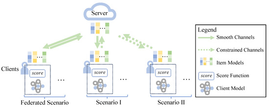 In another scenario, i.e., Scenario II, some clients may encounter limited communication bandwidth from time to time, which prevents them from efficiently downloading and uploading large volumes of item models. In this situation, clients with bandwidth limitation are also represented by .