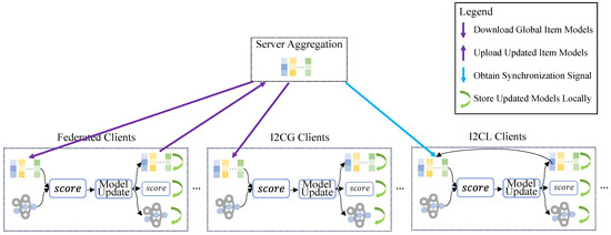 While clients in are unable to engage in standard federated training, they can leverage locally stored item models for local update if they have idle computation resources. In this scenario, clients in require only minimal communication resources to complete synchronization with the server. We enable clients having idle computation resources in under Scenario II to conduct local updates utilizing locally stored item models. Moreover, these clients acquire synchronization signals from the server to coordinate the training process. We refer to this strategy as the integration of communication and computation with local item models (I2CL). The workflow of I2CL clients is illustrated by the “I2CL clients” in Figure 2.