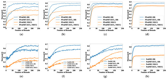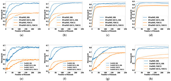 Learning curves of PFedMF/FedMF with or without I2CG. (a–d) PFedMF-I2CG: (a) MovieLens-100K. (b) MovieLens-1M. (c) Lastfm-2K. (d) Foursquare. (e–h) FedMF-I2CG: (e) MovieLens-100K. (f) MovieLens-1M. (g) Lastfm-2K. (h) Foursquare.
