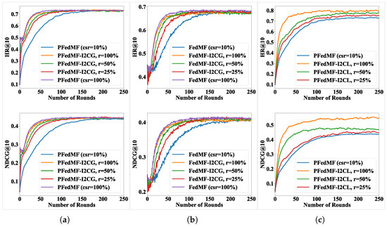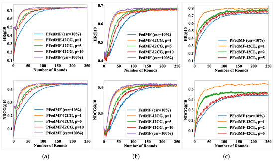 All methods are implemented in PyTorch 2.3.0. Set the client sample ratio () in FL to 10%, which means randomly selecting 10% of clients to participate in FL in each communication round and selecting clients from the remaining 90% to simulate communication-constrained ones. We will provide experimental results for = 20% and 50% if necessary. Except for partial experiments in Section 4.2.2, we always make all the remaining 90% of clients participate in I2C training. To ensure a fair comparison, we set the size of user–item embeddings as 32, the batchsize as 256 and local epoch E as 1. The total number of communication rounds is set to 300 for the MovieLens-1M dataset and 250 for other datasets, as these values have been experimentally determined to ensure convergence for all training methods. The learning rate is optimized within the range of [0.001, 0.005, 0.01, 0.05, 0.1, 0.2, 0.5], with the detailed configurations for each of the four datasets outlined in Table A1. Adjust other model specifications based on their respective original papers.