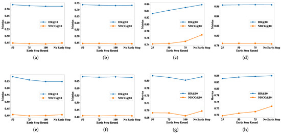 Impact of early-stop on recommendation performance of PFedMF/FedMF with I2CG. (a–d) PFedMF-I2CG: (a) MovieLens-100K. (b) MovieLens-1M. (c) Lastfm-2K. (d) Foursquare. (e–h) FedMF-I2CG: (e) MovieLens-100K. (f) MovieLens-1M. (g) Lastfm-2K. (h) Foursquare.
