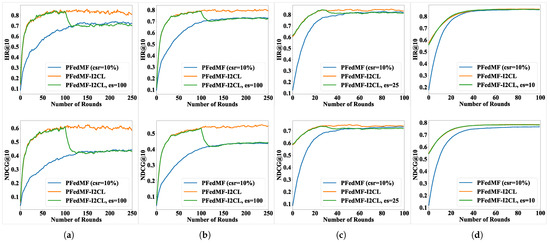 As discussed in Section 4.2.2, PFedMF-I2CL integrates both federated training and pure local training, ultimately achieving a dynamic equilibrium between the two. If pure local training is halted before the convergence of the system, the model’s performance will degrade to that of FL ( = 10%), as shown in Figure 8a–c. However, as Figure 8d shows, the removal of I2CL at the communication round of 10 does not diminish the performance of PFedMF-I2CL, which demonstrates the uniqueness of the Foursquare dataset. This observation may be attributed to the unique distribution characteristics of the Foursquare dataset, which motivates us to investigate the impact of early-stop on the performance of I2CL across more datasets in our future work.