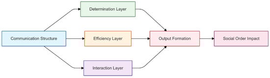 High-level communication structure. This diagram presents an overview of how communication structure integrates determination, efficiency, and interaction layers, leading to output formation and social order impact.