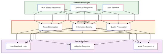 Figure 4 details the specific components within each layer, illustrating their hierarchical relationships and interconnections. The upper section of this figure focuses on the determination layer, which includes rule-based responses, contextual adaptation, and mode selection, providing structured and contextually relevant outputs. The middle section details the efficiency layer, emphasizing token optimization, information density, and quality preservation to ensure meaningful and resource-efficient communication. The lower section highlights the interaction layer, incorporating user feedback loops, adaptive responses, and mode transparency to enhance trust and legitimacy in AI-driven interventions.