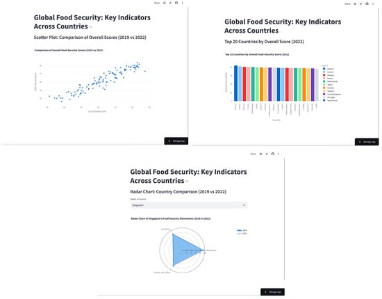 The first implementation focuses on global food security metrics across countries, providing comparative analysis through interactive visualizations. The implementation combines choropleth mapping for spatial analysis with detailed metric comparisons using Streamlit; see Figure 10. This visualization story enables policy-makers to: