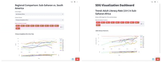 The second implementation focuses on educational metrics, particularly adult literacy rates in sub-Saharan Africa, demonstrating the framework’s utility in tracking development goals. Through interactive visualizations (see Figure 11), this implementation enables:
