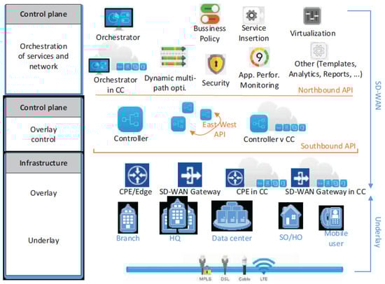 - Segeč, P.; Moravčik, M.; Uratmová, J.; Papán, J.; Yeremenko, O. SD-WAN-architecture, functions and benefits. In Proceedings of the 2020 18th International Conference on Emerging eLearning Technologies and Applications (ICETA), Košice, Slovenia, 12–13 November 2020; pp. 593–599. [Google Scholar]