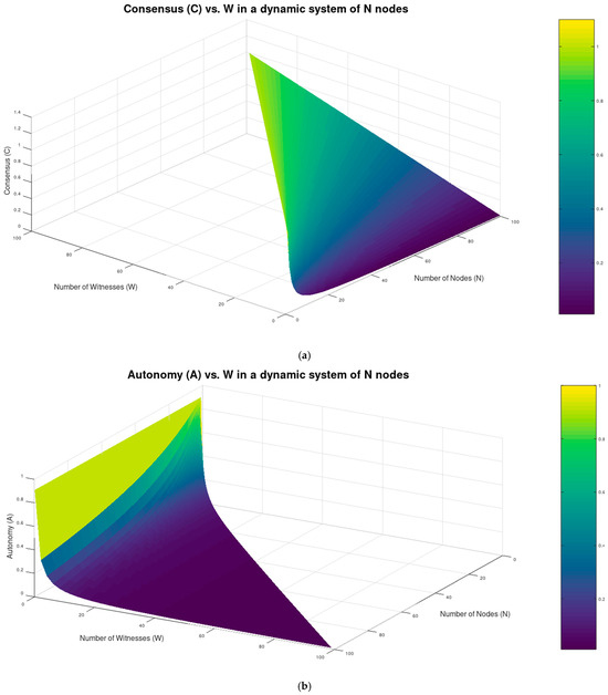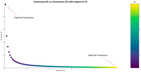 - Between Autonomy (A) and Consensus achievement (C)In an attempt to optimize one of two, the other is sacrificed. This derives from Equations (4)–(6) in Section 3.1 and is demonstrated in Figure 4, Section 4.2. An attempt to optimize Autonomy, i.e., moving , would leave the nodes without any resources to serve the community: W moves close to 0, leading Consensus achievement to minimum, and the system degrades down to a set of isolated nodes. Again, trying to optimize Consensus (, we would have to withhold resources from the atoms to serve the system, sacrificing Autonomy.This intrinsic constraint was revealed in this work by starting from two apparently independent starting points: while we define Autonomy in the micro-scale of the node, Consensus is defined in macro, with respect to the properties of the realm. This strengthens even more our initial hypothesis for the existence of an inherent intrinsic constraint among (A) and (C).