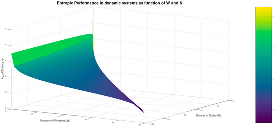 - Entropic Performance (P): At the cost of running the consensus mechanism, the observed information entropy of an isolated autonomous system decreases as W increases. As the number of witnesses increases, nodes store more uniform information, reducing the overall system entropy. This effect is strongest when the number of witnesses is low, meaning that even a small increase in witnesses leads to a sharp drop in entropy as discussed in detail in [14].