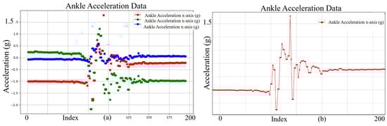 Visualization of the hand gesture: (a) X, Y, Z axis sensor-based signal; (b) X-axis ankle acceleration signal.