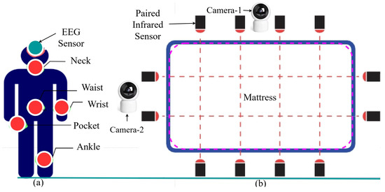 (a) A wearable sensor is located on the human body. (b) Layout of sensor and camera for the experiment in the UP Fall dataset [53].