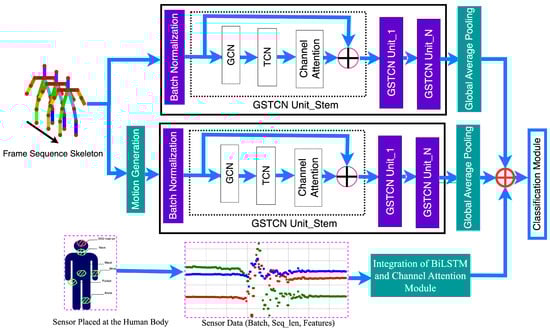 The GSTCAN model works directly on the raw skeleton and motion data without the need for dimensionality reduction. This allows the system to capture both the spatial and temporal patterns in the data [46]. This approach, inspired by recent work in human activity recognition and skeleton-based fall detection [41,54,55], helps the system learn detailed motion patterns directly from the raw data. The novelty of the skeleton and stream data lies in its ability to avoid dimensionality reduction and learn complex movement patterns from the raw data, which makes it more efficient in capturing detailed and meaningful motion patterns. For sensor data, we used the Bi-LSTM to extract sensor features, followed by CA [56] to refine them. This integration enhances the system’s ability to understand time-varying human motion characteristics. The novelty of our sensor stream module lies in combining the Bi-LSTM’s ability to capture long-range and temporal dependencies with the feature refinement of CA. This approach improves feature extraction and strengthens the model’s performance in dynamic and noisy environments, making it particularly effective for detecting events such as falls, where both temporal context and sensor channel importance are crucial.
