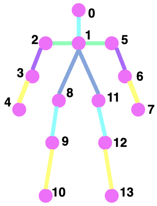 AlphaPose [58] was used to extract skeletal data from the video here. AlphaPose identifies the human bounding box and evaluates the individual’s posture encapsulated within that box. The accompanying figure illustrates the number of frames for AlphaPose, successfully acquired skeletal information. In the present study, frames from which skeletal data could not be retrieved were omitted; we elected to gather 14 key points utilizing AlphaPose, including the nose, shoulders, elbows, hips, buttocks, knees, and ankles, as depicted in Figure 5.