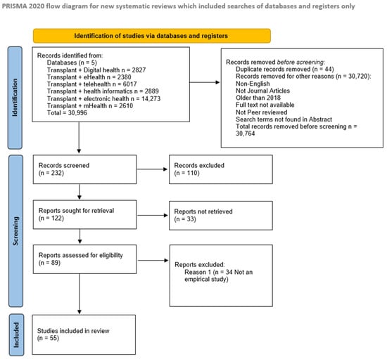This systematic review followed the Preferred Reporting Items for Systematic Review and Meta-Analysis (PRISMA) guidelines [28]. The first step of this process was using the research questions to help shape and develop a search strategy to capture all related and eligible papers in the targeted database. In this case, the following keywords were identified: “eHealth”, “digital health”, “telehealth”, “health informatics”, “electronic health”, “mHealth”, “mobile health”, and “transplant”. A systematic search of the literature on eHealth in transplants was conducted through the databases of Business Source Complete, PubMed, IEEE Xplore, JSTOR, Scopus, SpringerLink, ClinicalKey, ScienceDirect, Wiley Online Library, OVID, and Web of Science. The search was conducted within the databases by selecting eHealth-related terms using an OR operator (e.g., “eHealth OR electronic health OR digital health” OR “telehealth” OR “mhealth” [Title/Abstract]) and using the Boolean operator “AND” to search the keyword transplant simultaneously. The review focuses on articles published from 2018 onward to ensure the inclusion of the most recent and relevant findings. This timeframe reflects the rapid evolution of eHealth technologies, such as virtual health, digital tools, and their increasing integration into transplant care practices. Since technology and healthcare delivery methods have advanced significantly in recent years, studies published before 2018 may not adequately capture the current state of eHealth applications, their capabilities, or emerging challenges. The initial search was conducted between September and October 2023 and yielded a total of 30,996 publications.