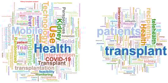 Paired word cloud analysis refers to the technique of comparing two or more word clouds side by side [74]. This approach helps identify similarities and differences in word frequency, sentiment, or themes across various datasets [74]. The paired word cloud analysis was applied over the abstracts and titles to identify recurring concepts/themes within the selected studies. The analysis from the title word cloud depicts the words that have been used often: (a) health with 12 repetitions, (b) mobile with ten repetitions, (c) technology with eight repetitions, (d) kidney transplant recipients with seven repetitions, and (e) transplant with six repetitions. The analysis from the abstract word cloud depicts the words that have been used often: (a) transplant with 160 repetitions, (b) patients with 148 repetitions, (c) telehealth with 74 repetitions, (d) technology with 34 repetitions, and (e) mobile with 32 repetitions.