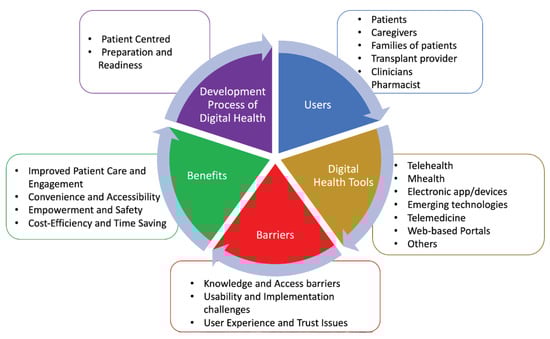 In terms of the users of eHealth tools, this study identified two main groups of eHealth users: (1) patients, caregivers, and families [30,37,40,73]; (2) transplant providers, clinicians, and pharmacists [10,11,23,26,34,46,47]. The findings indicate that both groups of users are connected through the shared goal of providing and receiving health care services for transplant purposes. Health devices facilitate the seamless exchange of information between patients/families and healthcare providers [40,46]. Patients can provide real-time health status and symptoms data, enabling healthcare providers to make informed decisions [39,51,52]. Health Information Technology (HIT) plays a crucial role in supporting these interactions by ensuring the integration of patient data across various touchpoints in the transplant journey [15,24]. Interoperable electronic health records (EHRs) are essential for managing patient history, donor–recipient compatibility data, medication adherence, and post-transplant monitoring [15,47]. Digital platforms further enhance engagement by enabling virtual health for follow-up care, patient portals for medication adherence tracking, and remote monitoring systems to detect early signs of organ rejection or complications [33,47]. Given that transplant patients often have comorbid conditions such as diabetes, hypertension, or infections, HIT must also support comprehensive care by incorporating these diagnoses into treatment plans and facilitating collaboration between specialties [18,47].