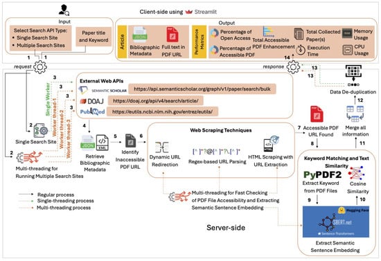 To increase availability and usability, this system is implemented as a web application system. On the client-side, Streamlit is adopted to rapidly build interactive web apps, and display the user interface [13]. On the server-side, the main program has been implemented using Python and supporting libraries. By utilizing endpoints from external web APIs [14], it retrieves article metadata in a JSON format using the requests library [15] and in an XML format using ElementTree library [16,17]. The program employs the concurrent.futures library to run multiple search site accesses on multi-threading and asynchronous execution to enhance processing speed by handling multiple requests concurrently [18]. The program employs BeautifulSoup and Regular Expression libraries [19] to parse HTML contents from article URLs and check accessible PDF files. Furthermore, the program employs PyPDF2 for extracting keyword from PDF files [20], and sentence-transformers library for extracting semantic representation of a sentence and check their similarity [21].