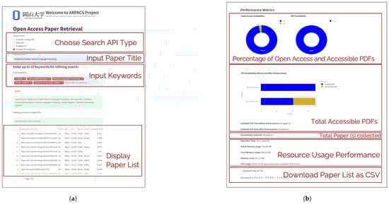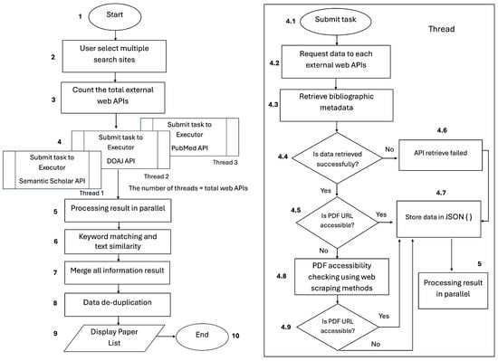 To ensure the robustness and contingency strategy of the proposed system, we implemented several techniques to handle the conditions of incomplete data or failures that may occur. As previously described in the multi-thread implementation, when one of the APIs fails to fetch data, the system will return information about which web APIs failed. However, APIs that successfully fetch data will continue to work on the task until it is finished and display the paper list results to the user. For the mechanism to handle incomplete metadata, the system gives an “N/A” mark for incomplete field metadata and applies an alternative method by using fast PDF checking based on web scraping for inaccessible PDF URLs.