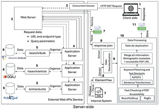On the server-side, the system processes the input, and will choose either a single or multiple search site to make request external web APIs. External web APIs receive the data requests and respond by providing bibliographic metadata in the JSON or XML format. The system retrieves the metadata and identifies the inaccessible PDF URLs, where web scraping is implemented to check the accessibility of PDFs running in multi-threading. Once an accessible PDF URL is found, the system encodes the paper title and extracted keywords from PDF files, as well as the title and keyword queries by user, into semantic sentence embeddings to calculate similarity. Subsequently, the system merges all the retrieved information, removes the duplicate metadata records, and prepares the result in a structured format before being sent back to the client-side.