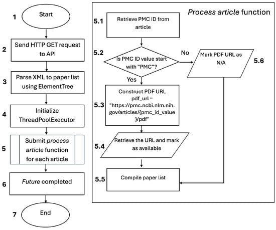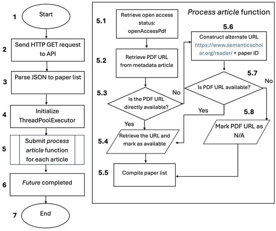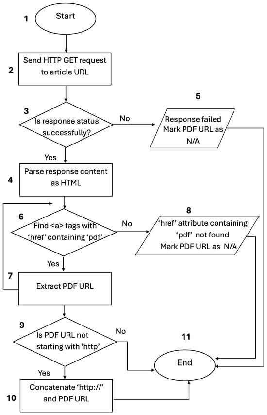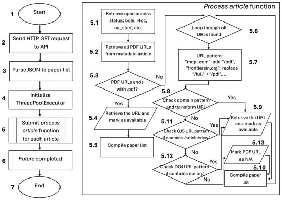 Respecting all license agreements on each API, we configured the system the developed system by including user agents in the script code, retrieving primary metadata directly from the API endpoint, setting a rate limit of 100 articles per API, and setting a delay time between 1 and 3 s for the request. Regarding incomplete PDF URLs in some metadata, we use web scraping or the fast checking of PDF accessibility as an alternative method.