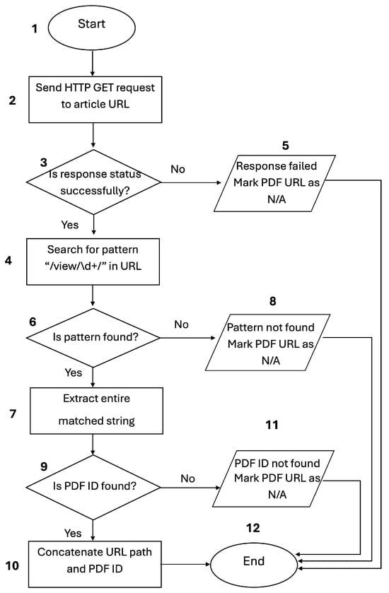 In [37], Jian-Ping et al. proposed using a regular expression to extract weather data from Sohu, Sina, and Tencent websites. The platform utilized java.util.regex package in Java, which provides classes for parsing pages with regular expressions. Leveraging this method, we identify the URL path structure on a journal article page built using Open Journal Systems (OJS) and extract PDF ID based on regular expression pattern matching.