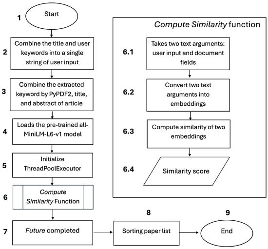 In line with the study by Colangelo et al. [40], which states that there is a trade-off between accuracy and computational efficiency based on the underlying pre-trained model architecture, we adopt MiniLM L6 to assess semantic similarity between keyword extraction from PDF and query without compromising processing speed. Given that the reference paper collection system requires fast response time while maintaining relevance accuracy.
