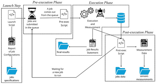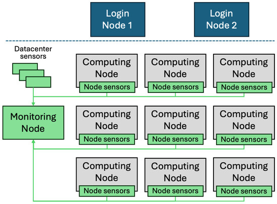 CRESCO6 is managed by the LSF scheduler (https://www.ibm.com/docs/en/spectrum-lsf/10.1.0?topic=lsf-session-scheduler accessed on 29 April 2025) and shared with many users. As shown in Figure 1, the system provides two login nodes on which job runs can be built and submitted. One node is designated as a monitoring node to display and retrieve the data measured by the sensors.