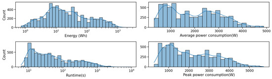 Distributions of energy-related metrics in C6EnPLS: total energy consumption, runtime, average, and peak power. The line highlights the kernel density estimation of the variables’ probability distributions.