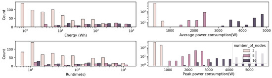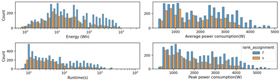 Figure 3 presents histograms for energy, runtime, peak, and average power consumption metrics, showing the general shape of the data distributions when considering the whole dataset samples. So, for example, the energy graph reports different ranges of energy consumed on the x axis, and the height of the bars indicates the number of samples (i.e., job runs present in the dataset) that fall into the corresponding energy range. Above the histograms, a density curve estimates the variable’s probability distribution. Given the skewed nature of energy and runtime data deducible from the values in Table 3, these two metrics are presented in a logarithmic scale to better appreciate their trends. Besides an unusual, non-strict correlation between runtime and energy consumed, the graphs suggest that the average value of the system power follows a similar trend to that of the maximum system power. However, if we restrict our attention to different dataset slices, other trends emerge.