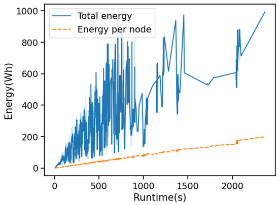 As a consequence, the execution of a certain job on the minimum number of physical machines may require so much more time than executing it on more machines, so that the increase in the energy derived by the employment of more nodes is actually conterbalanced by the fact that the job requires much less time to execute. The same considerations can be made looking at Figure 5, which correlates energy and runtime: jobs are ordered by runtimes on the x axis and the two lines show the energy consumed by the job (total energy) and its value normalised by the number of involved nodes (energy per node). As expected, the energy per node is linear in the runtime, while the total energy consumed by a job shows a much higher variability caused by the aforementioned resource contention.