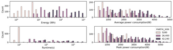 Different trends are visible in Figure 6, where the data distributions are limited to three distinct matrix ranks (5280, 26,400, and 42,240). In general, jobs working on smaller matrices have lower runtimes and energy utilisation than solvers working on big matrices, while the distributions of average and peak power consumption seem to be less matrix-size-independent.