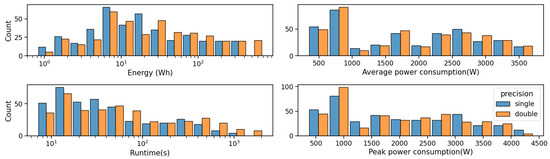Figure 7 shows the distribution of the four metrics when different rank assignment methods are employed (“span” and “fill”). All in all, the trends do not highlight a significant difference in any metric between the two cases. Similar considerations can be made for Figure 8, which unveils the distributions when single or double precision is used in the solving process. However, in this case, a slight difference can be spotted in the energy (and runtime) distribution domains: double-precision jobs can consume up to 1000 Wh, while single-precision ones do not go beyond 500 Wh.