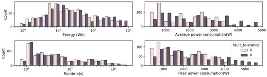 While a comparison by algorithm did not highlight significant differences, in Figure 9, the focus is on the level of fault tolerance that the solver can handle (i.e., the maximum number of processors that can incur a hard fault without invalidating the whole computation). For the sake of clarity, only two levels of fault tolerance are shown in the graph: 0 (i.e., the fault tolerance method is not implemented) and 8. Similar trends are visible for all the metrics, with only a slight difference in the shape of the histograms for average and peak power: the graph with a fault-tolerance level equal to 8 shows a longer tail to the right, corresponding to more cases with high average and peak power with respect to the no-fault-tolerance case. All in all, fault tolerance slightly influences the peak and average power without significantly impacting the overall energy consumption.