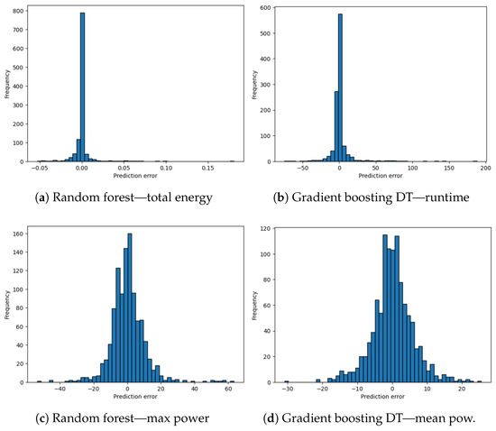 The histograms in Figure 10 depict the distribution of prediction errors for the four chosen targets. The x axis of each graph represents the prediction error value, while the y axis represents the error frequency, that is, the number of job runs tested that returned that error value. The models were trained on 70% of the data, and the remaining 30% was used for the testing. The errors for total energy consumption and runtime show a similar trend, with a significant peak centred around zero. The errors for the power targets (maximum and average power) exhibit a wider distribution, ranging from 0 to 40 W in absolute value. However, considering the average values of the power targets (with a maximum of approximately 2130 W and 1960 W on average), this error range remains very good.