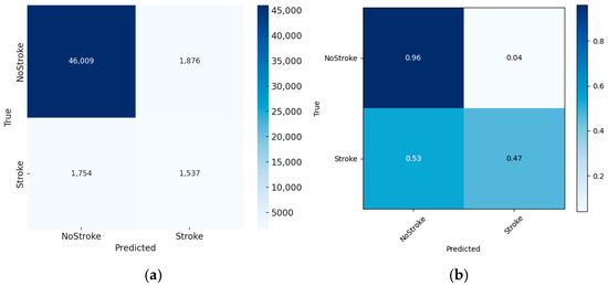 XGBoost confusion and normalized XGBoost confusion matrix: (a) XGBoost confusion matrix—shows the raw confusion matrix indicating the number of correctly and incorrectly classified cases; (b) Normalized XGBoost confusion matrix—illustrates the percentage distribution of classifications between stroke and no-stroke.