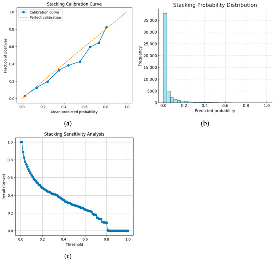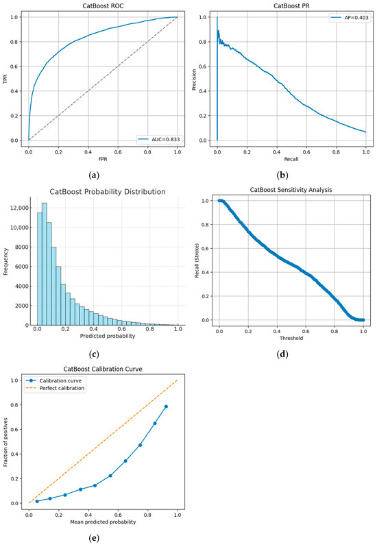 A comprehensive comparative analysis is conducted through a methodical examination of both numerical results and visual diagnostics, providing a critical basis for understanding the efficacy and limitations of the various models. The CatBoost model, for example, exhibits performance patterns similar to XGBoost. Its ROC and PR curves are presented in Figure 4a, the CatBoost ROC curve, and Figure 4b, the CatBoost precision–recall curve, while its probability distribution and sensitivity analyses are shown in Figure 4c, the CatBoost probability distribution, and Figure 4d, the CatBoost sensitivity analysis, respectively. The CatBoost calibration curve in Figure 4e further corroborates these observations.