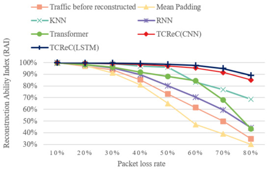 The RAI values of TCReC and KNN are close when the packet loss ratio is lower than 50%, while the RAI values of other models are much lower. When the ratio exceeds 50%, TCReC shows significantly better reconstruction ability than the other models. The RAI of TCReC (combined with LSTM) is 94.99% even when the packet loss ratio reaches 70%, while the RAI of traffic before reconstruction is only 49.77%.
