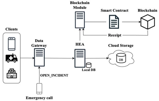 Overview of the proposed architecture, featuring the HEA, data gateway, blockchain integration for secure incident data management, and cloud storage for persistent data storage.