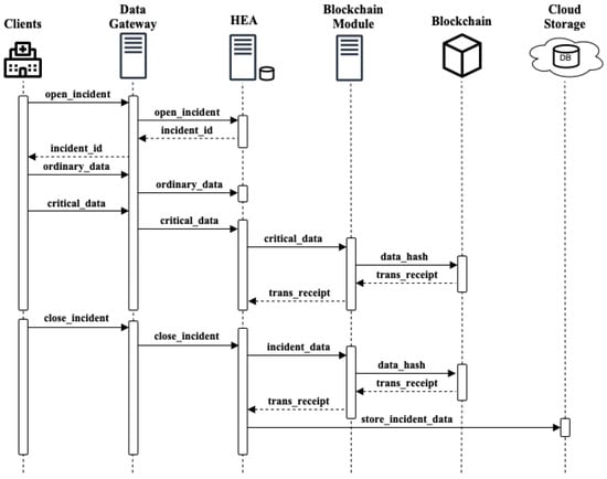 The lifecycle of an incident highlights interactions among components and the HEA’s role logging critical events into the blockchain and storing incident data in the cloud servers.
