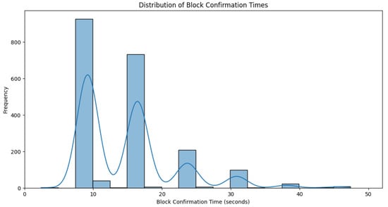 Histogram illustrating the distribution of block confirmation times, highlighting variability in transaction processing speeds within the blockchain network.