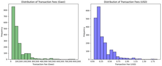 Comparative distribution of transaction fees, presented in both Gwei (left) and USD (right), illustrating cost variability in blockchain-based data recording.