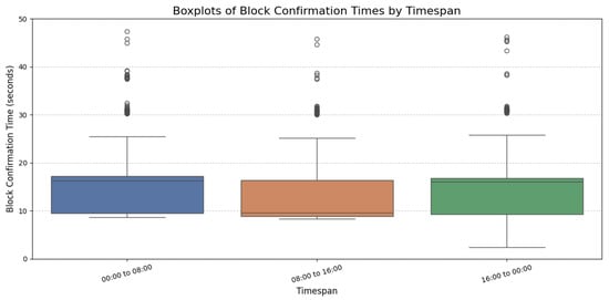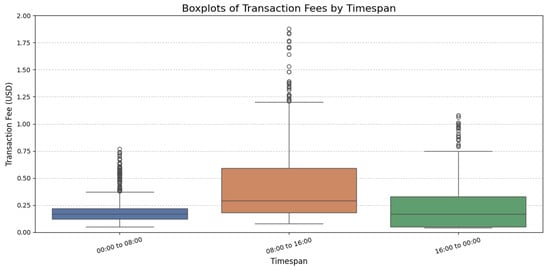 To evaluate the effect of the time of day on block confirmation times, we grouped transactions into three equally sized timespans, each spanning eight hours. Table 5 reports the metrics for each transaction group. Figure 4 shows the results of this analysis as a plot of the distribution of transaction fees in Gwei and USD. Figure 5 presents boxplots of transaction execution times, while Figure 6 displays boxplots of transaction fees.